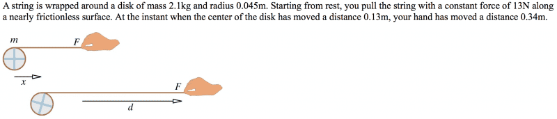 A string is wrapped around a disk of mass 2.1kg and radius 0.045m. Starting from rest, you pull the string with a constant force of 13N along a nearly frictionless surface. At the instant when the center of the disk has moved a distance 0.13m, your hand has moved a distance 0.34m.
