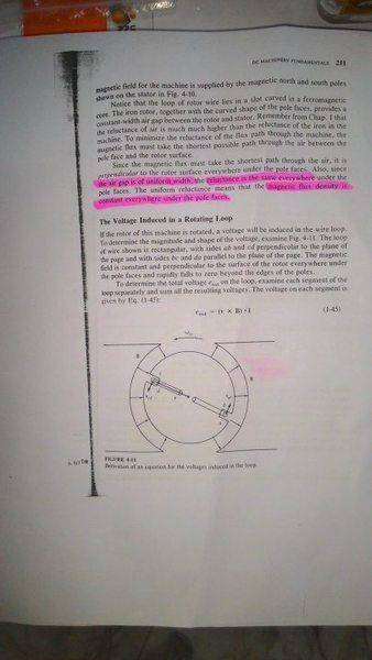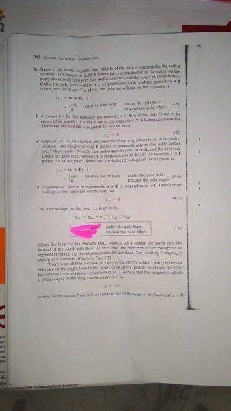 The discussion centers on understanding the signs of induced voltage in rotor segments, specifically referencing equation 4-19 from a textbook. Participants express confusion regarding why the expression (vxB)•l does not equate to eab. The need for clearer visual representations of the equations is emphasized, with suggestions for the original poster to type out the equations for better clarity.