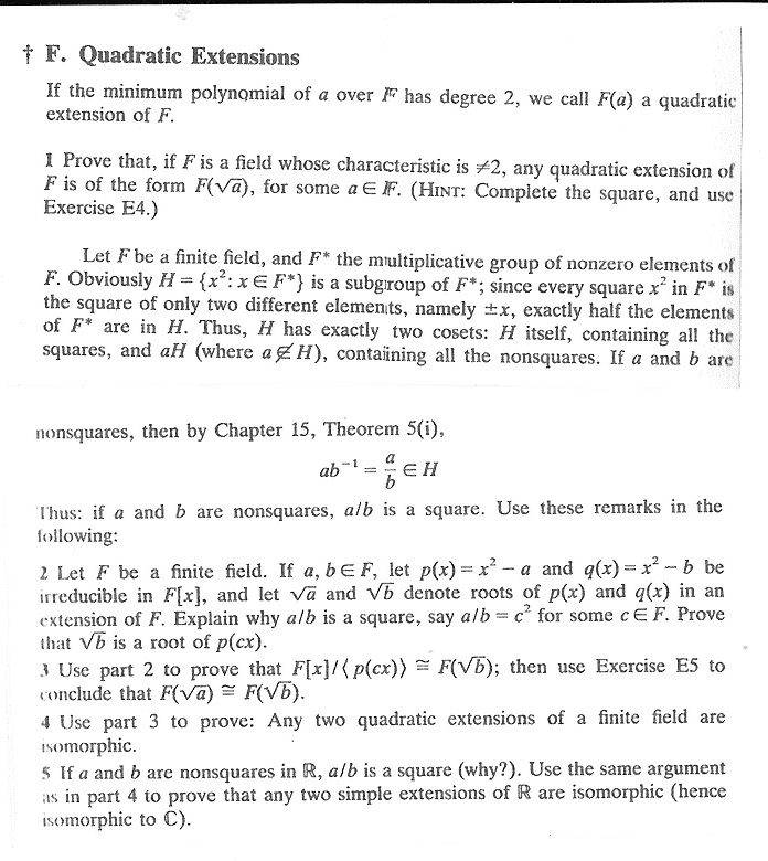 I solved part 4 by arguing that any extension is of the form \(F(\sqrt{a})\) by question 1 and any two such extensions are isomorphic by question 3.