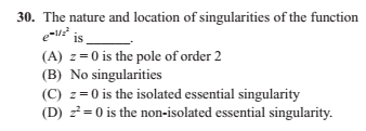The discussion revolves around the nature of the singularity of the function e^(-1/z^2), particularly at the point z = 0. Participants are exploring whether this point represents an essential singularity or if the function behaves differently under certain conditions.