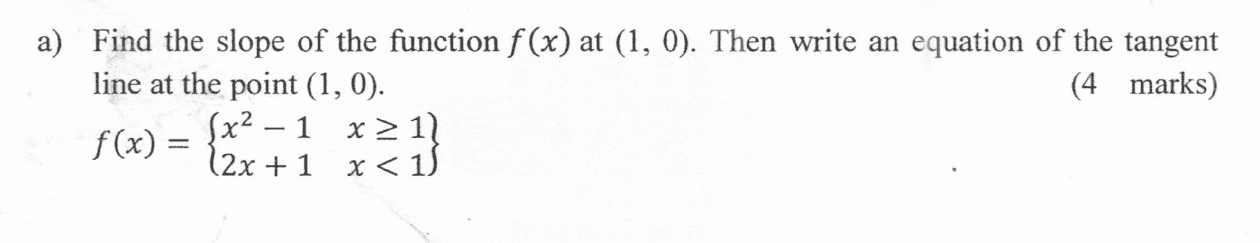 The discussion focuses on determining the slope of functions at the edge case of $x=1$. For the function $f(x)=x^2-1$, the slope at $x=1$ is calculated using the derivative, yielding a slope of 2, and the graph includes the point $(1,0)$. In contrast, for the linear function $f(x)=2x+1$, the slope at $x=1$ is 2, but the graph does not include the point $(1,0)$. These examples illustrate how to analyze slopes and points of intersection for different types of functions.