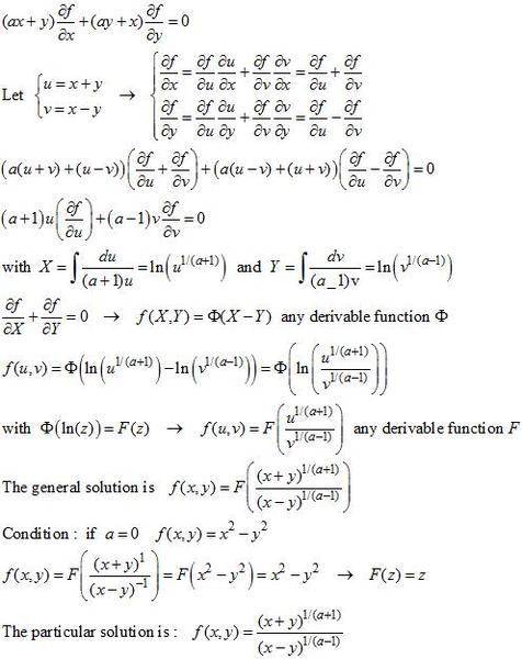 The discussion focuses on solving the differential equation (ax+y)∂f/∂x + (ay+x)∂f/∂y = 0, with the specific condition that when a=0, f(x,y) equals x^2 - y^2. Participants explore methods such as using the total differential and the relationship between partial derivatives to analyze the equation. A suggested approach involves a change of variables that simplifies the problem significantly. The conversation emphasizes the importance of understanding the implications of the variable 'a' on the solution. Ultimately, the thread seeks to clarify the steps needed to solve the given partial differential equation effectively.