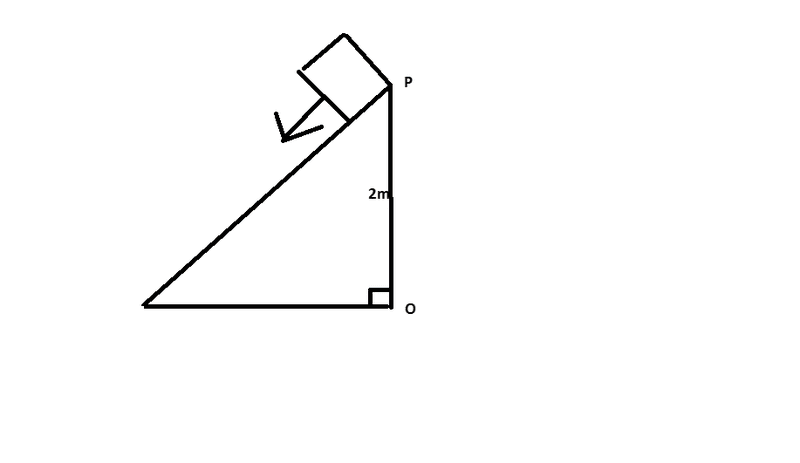 A 0.5 Kg block slides from rest down an inclined plane as shown in the figure. The velocity at the bottom of the plane is 6 m/s. The vertical distance PO is 2m.