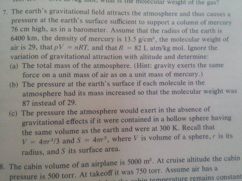 Problem from the book "Engines, Energy and Entropy", Page 55, question 7 has me stumped. It doesn't feel like their is sufficient information to work out the mass of the air. They've given us density (as seen in the picture, if the upload works) , which is mass over volume, but unless you know the volume of mercury you can't work out the mass from that. Were only given the height of the mercury (maybe in a barometer), But without knowing the area that this height takes.