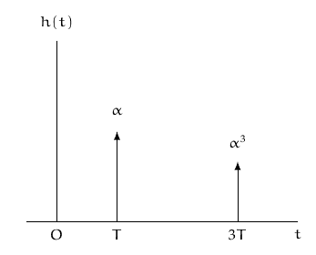 In a long-distance telephone communication, an echo is sometimes encountered due to the transmitted signal being reflected at the receiver, sent back down the line, reflected again at the transmitter, and returned to the receiver. The impulse response for a system that modles this effect is shown in figure, where we have assumed tat only one echo is received. The parameter \(T\) corresponds to the one-way travel time along the communication channel, and the parameter \(\alpha\) represents the attenuation in amplitude between transmitter and receiver.
