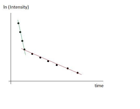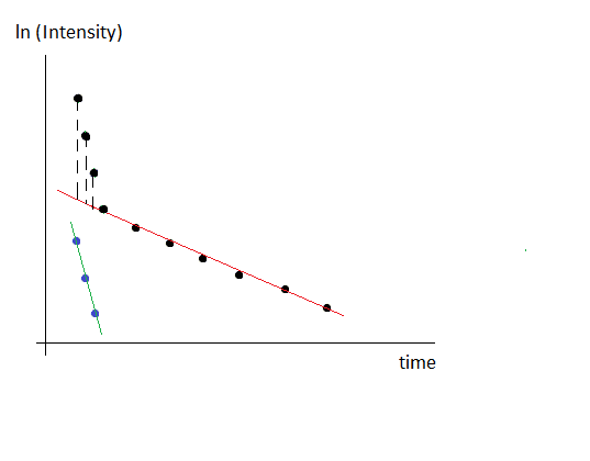 I have experimental nuclear magnetic resonance data that describe T2-relaxation of the nuclei in the sample of interest. The experimental points obey bi-exponential dependence: I = I1*exp(-t/T2_1) + I2*exp(-t/T2_2), where I is current intensity, I1 and I2 are intensities which represent fractions of two T2 components - T2_1 and T2_2. The purpose is to calculate T2_1 and T2_2. To calculate T2_1 and T2_2, I fit bi-exponential equation mentioned above to experimental data points. But in order to ensure that calculated T2 values are true, I'd like to build semilog graph. For this, I take natural logarithm of experimental intensities, and thus the vertical axis in the graph is now in ln(I). Then, in obtained semilog graph, I need to divide points into two parts: first part of points will be fitted by linear equation y1 = C1 - t/T2_1, and the second part of points will be fitted by linear equation y2 = C2 - t/T2_2. And here I have two variants of how to do this fitting. The first variant is just to fit each part of data points with linear equation with corresponding initial guesses. And the second variant is the following: first, I fit the second part of points with equation y2 = C2 - t/T2_2, i.e. 7 points as you can see in the attached images. Thus I found C2 and T2_2 from fit. Then, using equation y2 = C2 - t/T2_2, I find ln(I) values for time values corresponding to the first part of points (i.e. first 3 points as you can see in the attached images). After that, I subtract these extrapolated ln(I) values from first three experimental ln(I) values. Let's call these new values as ln(I)1, ln(I)2, ln(I)3. Finally, I fit these 3 points with equation y1 = C1 - t/T2_1 and find the parameters C1 and T2_1. Could you please tell me, which variant of calculating T2 values is true? Please find attached two images which show the difference between two mentioned methods of calculating T2 values.