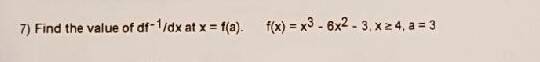 The discussion revolves around finding the value of the inverse derivative at a specific point for the function $$f(x)=x^3-6x^2-3$$, particularly at $$x=f(a)$$ where $$a=3$$. Participants explore the implications of the function's behavior, its one-to-one nature, and the necessary steps to isolate the inverse and compute the derivative. The scope includes mathematical reasoning and technical exploration.