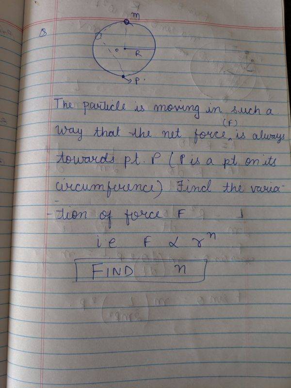 - The particle is moving in circular orbit such a way that the net force (F) is always towards the point p (point p is on the circumference of circle). Find the variation of force F with respect to r.