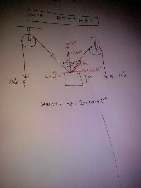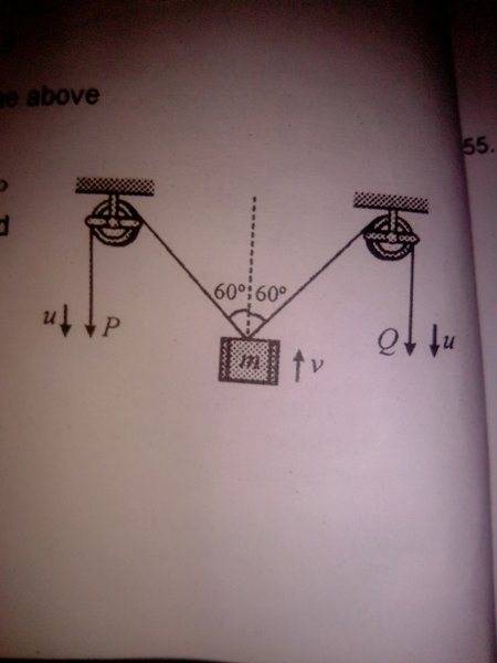 :[/B]In the arrangement shown in the figure, the two ends P and Q of the light unstrechable string move downward with uniform speed u as shown. The upward speed of the mass m is v. Then which of the following is correct:A) v cos60°=u