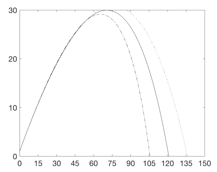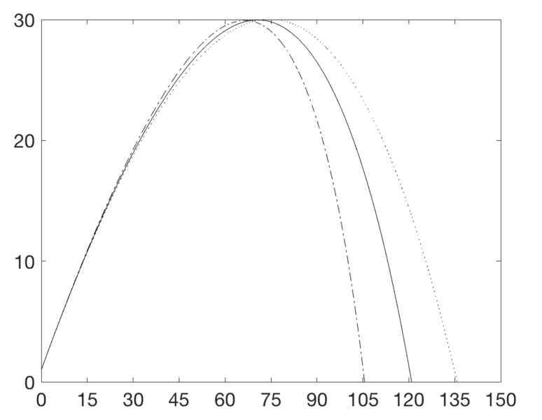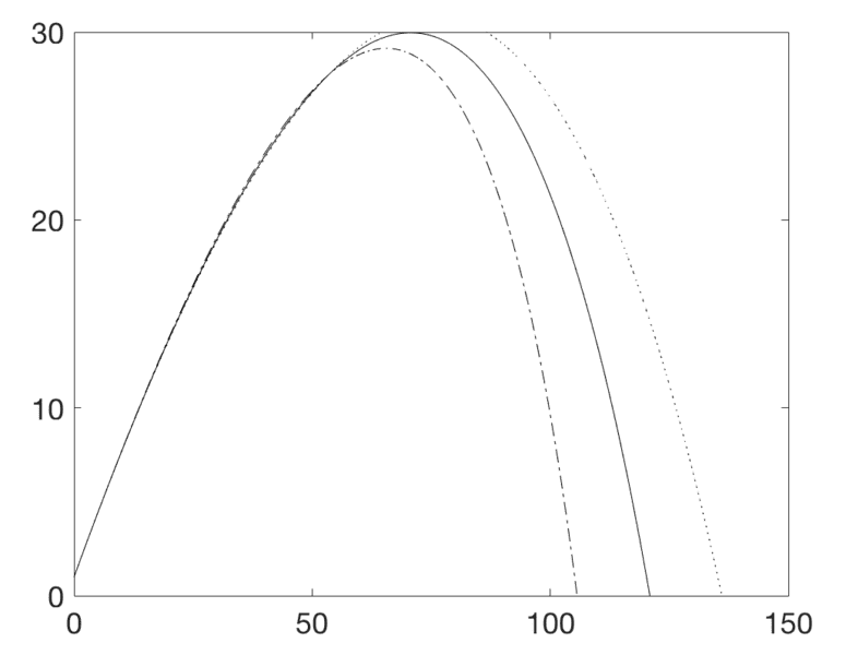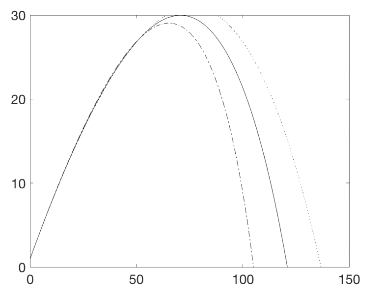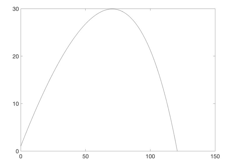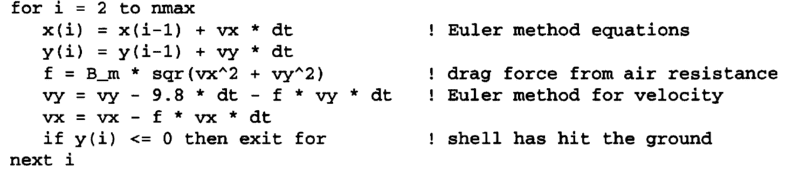 You'll notice the line of code right before the For loop is what I am speaking of. You can also see in my for loop to lines of code commented out. Not knowing what v is, I thought maybe it is the current velocity and that perhaps Bm and then the drag force should change as the velocity changed. It brought my plot closer to where it ought to be (a peak at x= 70 and y=30 and a landing point at about x=120)