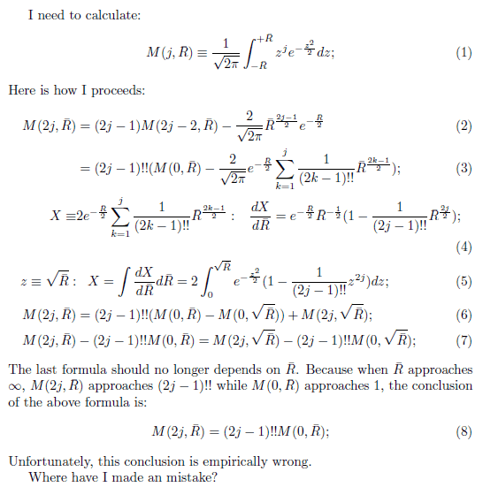 The last formula should no longer depends on $\bar{R}$. Because when $\bar{R}$ approaches $\infty$, $M(2j, \bar{R})$ approaches $(2j-1)!$ while $M(0, \bar{R})$ approaches 1, the conclusion of the above formula is: