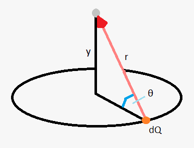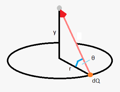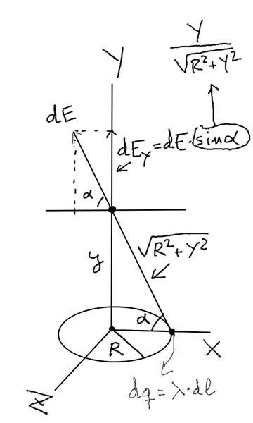 ##|E_y|=(\frac{1}{4\pi ε_0})⋅\int \frac{dQ}{(x^2+y^2)}=(\frac{2\pi λ}{4\pi ε_0})⋅\int \frac{ydr}{(r^2+y^2)^{\frac{3}{2}}}=(\frac{2\pi yλ}{4\pi ε_0})⋅\int \frac{dr}{(r^2+y^2)^{\frac{3}{2}}}##