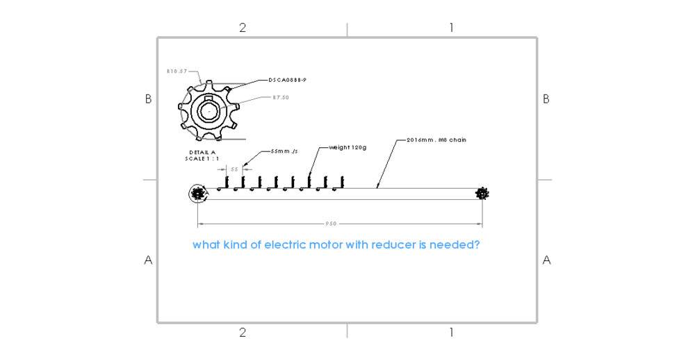 To select an appropriate electric motor with a reducer for a system requiring a speed of 55 mm/s, it is essential to calculate the necessary gear reduction ratio based on the available motor RPM and the sprocket configuration. A 9-tooth sprocket will move 9 rollers per revolution, which directly influences the required motor specifications. Additionally, understanding the load dynamics, such as whether the chain transports items or lifts masses, is crucial for determining the motor power needed, utilizing kinetic energy (KE) and potential energy (PE) equations.