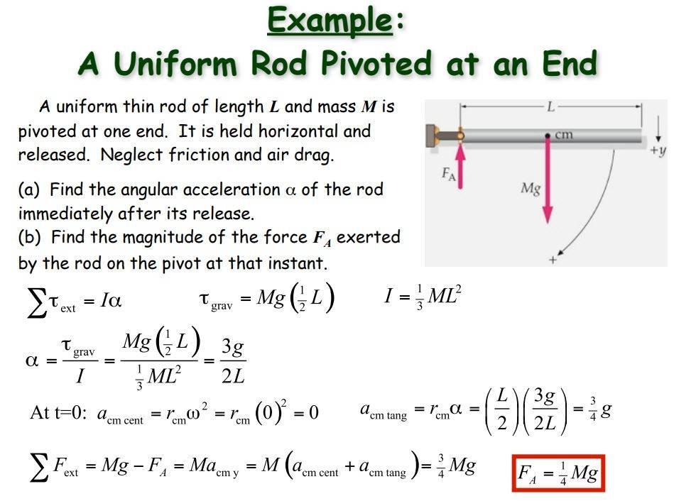 I have seen an example of a horizontal beam on a hinge. Beam of length L acted on my gravity MG at center, where the hinge supplies 1/4MG force to the door. Therefore there is a net torque, causing angular acceleration and a net force, causing translation about the center of mass.