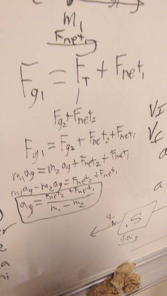 We suspended the two weights on opposite sides of the pulley and we are measuring how far and fast the heavier mass falls. We thought we had the correct possible formula but it have us a wrong answer. We have to assume that we don't know g before hand. Here is a picture of our formula.