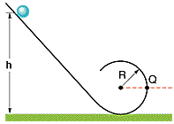 A small solid marble of mass m and radius r will roll without slipping along the loop-the-loop track, shown below, if it is released from rest somewhere on the straight section of track. For the following answers use m for the mass, r for the radius of the marble, R for the radius of the loop-the-loop and g for the acceleration due to gravity.
