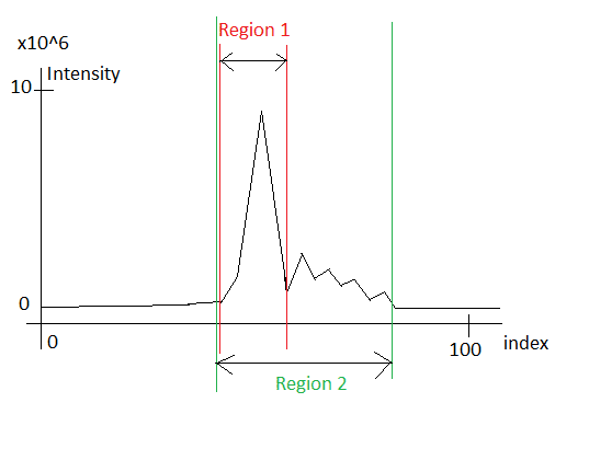 I have nuclear magnetic resonance spectrum. The vertical axis is intensity, and the horizontal axis is index. I need to find integral under the peak. But I am not sure, what region should I choose for integration - region 1 or region 2? Please find attached the spectrum.