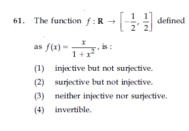 The discussion revolves around determining the type of function based on its injectivity and surjectivity, with a specific focus on a multiple-choice question regarding its range and domain. Participants are analyzing the properties of the function defined over a specified interval.