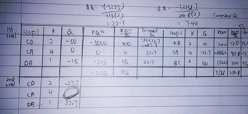 The discussion centers on determining the appropriate flow rate value for junction CA in the Hardy Cross method during the second trial of the first loop. The participants debate whether to use the corrected value of -15.3 from the second loop or the corrected value of 22.7 from the first loop. The consensus leans towards using the value of 22.7 from the first loop, as it reflects the most accurate flow rate prior to the second iteration.