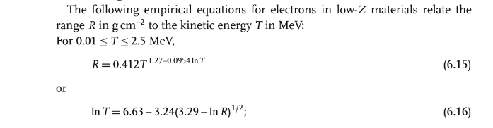 Range when 0< T <= 2.5 MeV: R= .412+T^[1.27-.0954*ln(T)] where T is kinetic energy of beta particle