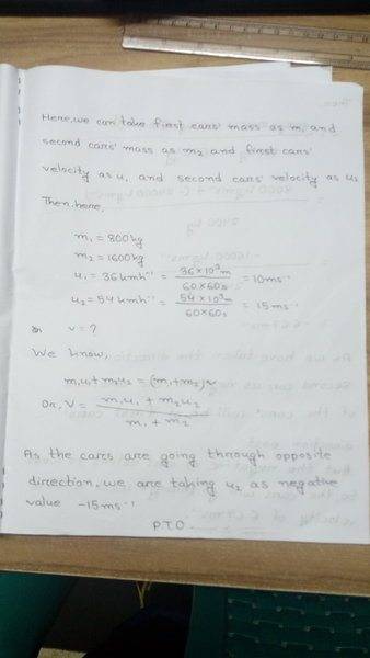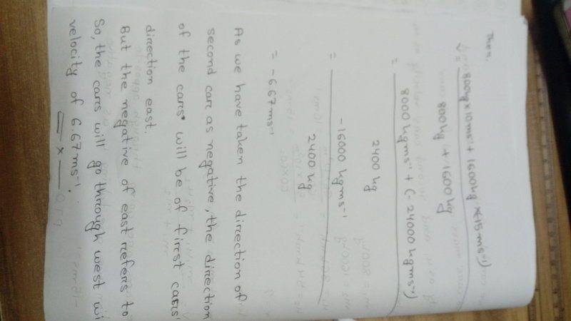 A car of 800 kg was going towards east with a velocity of 36km/h and an another car of 1600 kg was going towards west with a velocity of 54km/h. After collision, in which direction and with how much velocity will the cars go?