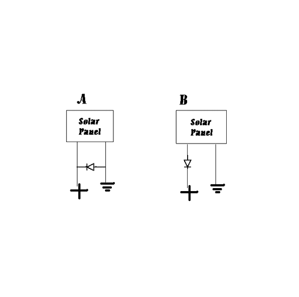 - Some participants suggest that the diode in diagram A is beneficial for multiple panels, especially when one is shaded, as it allows current to continue flowing.