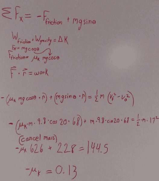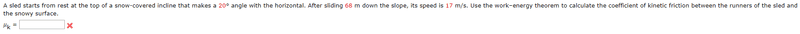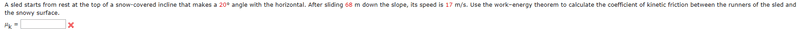 The problem involves a sled sliding down a snow-covered incline, with the goal of calculating the coefficient of kinetic friction using the work-energy theorem. The incline is at a 20° angle, and the sled's speed after sliding 68 m is given as 17 m/s.