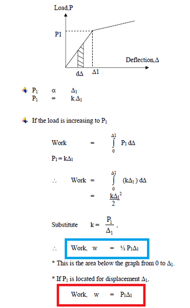 I think W = 0.5 P Δ is more appropriate because W = force x displacement , which is also area under the graph ... Since the area under the graph is triangle , so 0.5 is necessary [/B]
