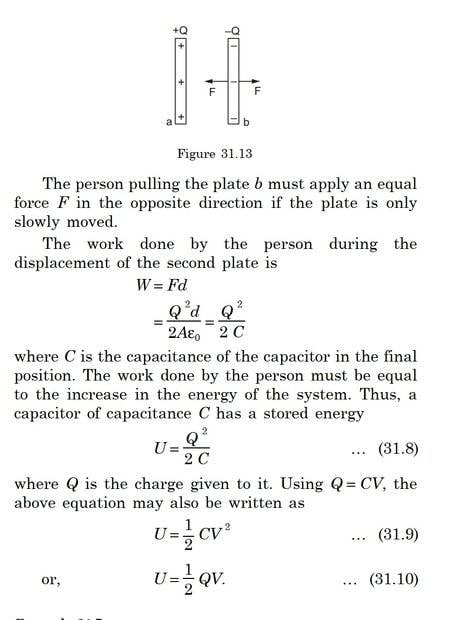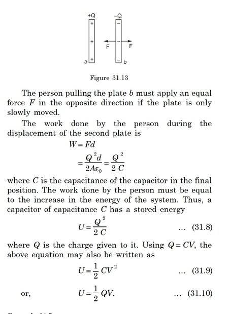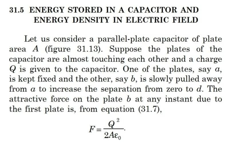 The discussion revolves around the energy stored in a parallel plate capacitor, exploring the relationships between charge, capacitance, voltage, and electric field. Participants examine the implications of varying distances between the plates and the assumptions made in the textbook regarding constant capacitance and voltage.