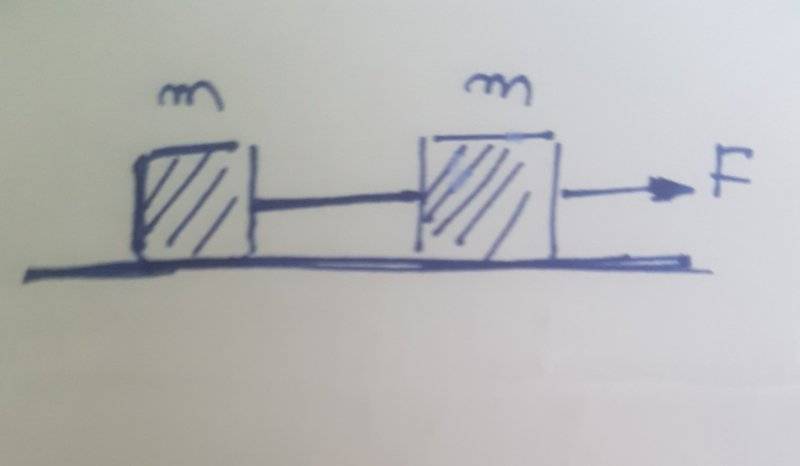 2 objects of the same mass are on a non-frictional level and are connected with a thread which has a resistibility limit T=20N. What is the least froce we should apply so that the thread breaks?