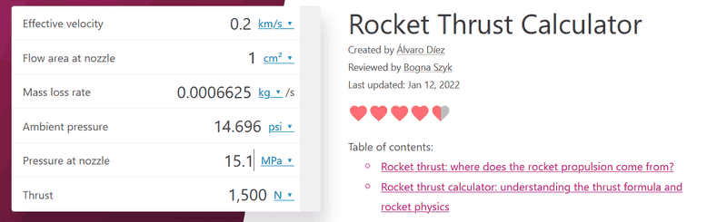 Several things I don't understand: is 1cm^2 nozzle with 15.1 Mpa pressure possible? How is the effective velocity calculated especially if you aren't combusting but just open cylinder to release pressure? Why is the mass loss rate negative if you increase pressure? I should've solved this as a polynomial calculation since the calculator gives odd values unless you reload. Thank you.