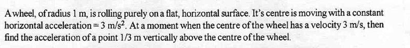 The discussion revolves around a wheel rolling on a horizontal surface, focusing on the components of acceleration for a point on the wheel. Participants explore the relationships between linear and angular quantities, including radial and tangential acceleration, while questioning the assumptions made in the calculations.