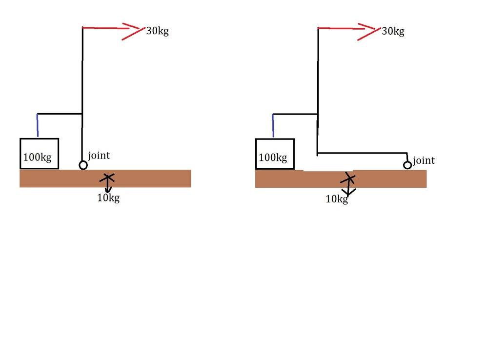 Useing only external forces (100kg,10kg and 30kg) I can treat joint as fixed conection and still get correct results,in both case pivot point is at same positon,even right case has joint at right side of beam..