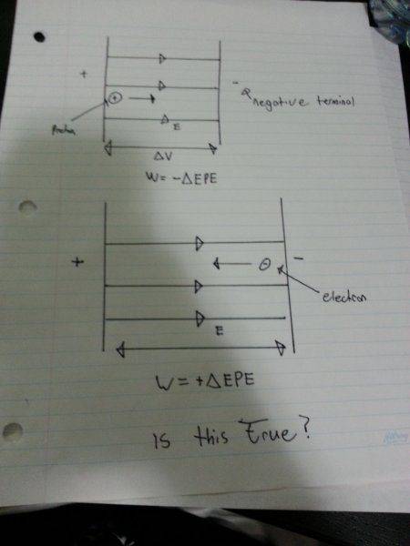 The discussion clarifies the relationship between work and electric potential energy (EPE) in the context of electric fields. When a positive charge moves towards a negative terminal, it loses potential energy, resulting in work being equal to negative change in EPE (W = -ΔEPE). Conversely, a negative charge moving against the electric field towards a positive terminal gains potential energy, leading to positive work (W = +ΔEPE). The equations W = EPE = q*ΔV and W = -ΔEPE are confirmed as accurate representations of these concepts.