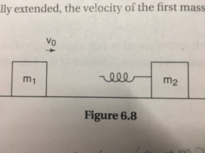 A mass m_1, initially moving at a speed v_0, collides with and sticks to a spring attached to a second, initially stationary mass m_2. The two masses continue to move to the right on a frictionless surface as the length of the spring oscillates. At the instant that the spring is maximally extended, the velocity of the first mass is...?
