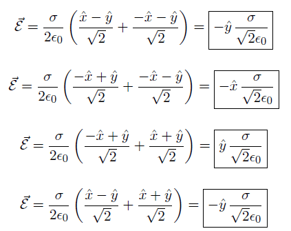 The discussion revolves around the electric field generated by two infinite sheets of electric charge, one positively charged and the other negatively charged, which intersect at right angles. The original poster seeks clarification on the directional components of the electric field vectors derived from these sheets.
