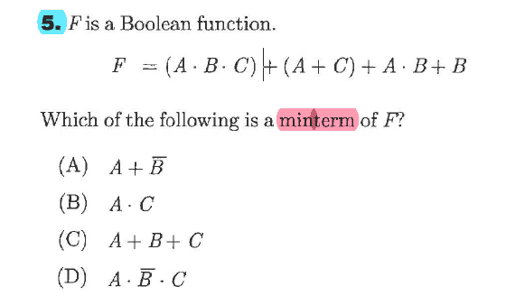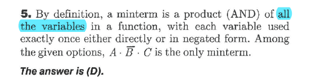 I am not sure if simplifying the function is necessary here and if I'm not supposed to for whatever reason I would think that either (AB) or (ABC) from the original function F(A,B,C,D) would be correct. Maybe ABC would be the best option because it includes all variables of the function. Regardless, none of the available solutions match what I believe the solution is and upon looking at the posted solution in the book it says AB'C is the solution. I'm totally lost as to where this minterm actually came from as it doesn' even appear in the original function. Is there some sort of algebraic manipulation going on here? What am I not seeing?
