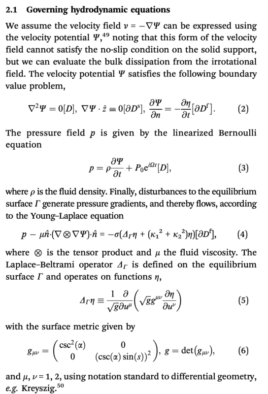 Suppose we have an incompressible, viscous sessile drop subject to a time-dependent pressure field ##p## on a substrate. Let ##\mu## be dynamic viscosity, ##u## be the fluid velocity field, ##\kappa_{1/2}## curvatures of the fluid surface, ##\sigma## surface tension, ##\hat n## normals to the equilibrium surface, and ##\eta## the disturbed interface.