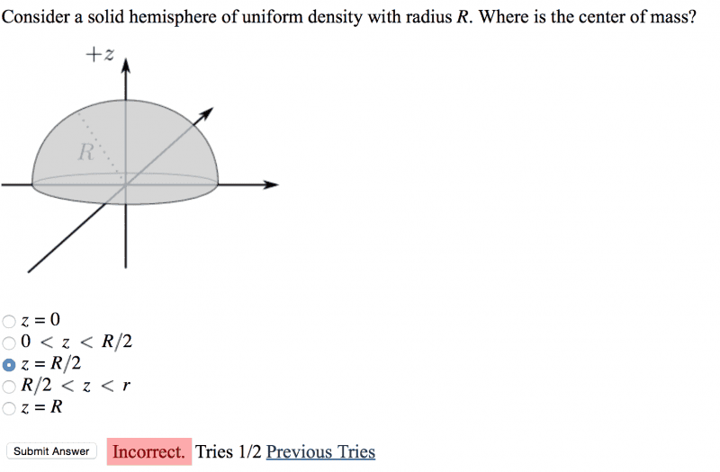 The center of mass of a solid hemisphere with uniform density and radius R is located between the points 0 and R/2 along the z-axis. The discussion clarifies that the center of mass cannot be exactly at R/2 due to the distribution of mass, which results in more mass being below that point. Participants emphasized the importance of understanding the concept of center of mass as the average of mass positions rather than relying on visual estimations. The conversation also highlighted the need for analytical reasoning over direct answers in homework forums.
