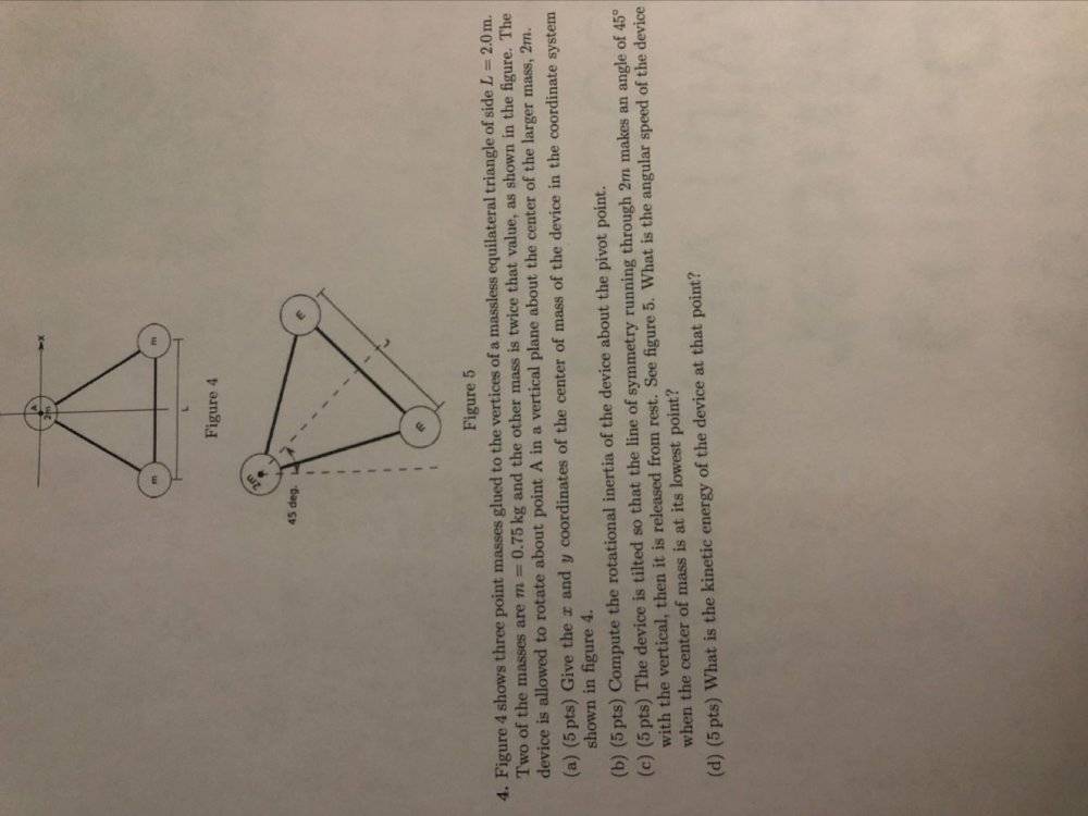 Figure 4 shows three point masses glued to the vertices of a massless triangle of side L=2.0 m. Two of the massess are m=0.75kg and the other mass is twice that value, as shown in the figure. The device is allowed to rotate about point A in a vertical plane about the centre of the larger mass, 2m. Give the x and y coordinates of the centre of mass of the device in the coordinate system