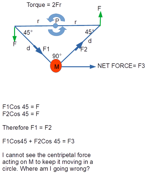 2. I am assuming that the forces F1 and F2 will remain unchanged when the triangle is angularly accelerating . I've been informed they may change but that doesn't make any sense to me because the torque forces F are constant. There is a push force F1 on M via the left arm and a pull force F2 on M via the right arm. When I add those 2 forces , the resultant force is always tangential to the circular path but where is the centripetal force to keep mass M moving in a circle?
