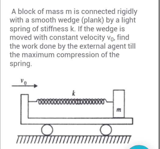 The problem involves a plank moving with uniform velocity to which a mass is connected by a spring. The original poster is trying to determine the work done by an external agent on the maximum compression of the spring, while questioning the source of the force required for compression given the plank's constant velocity.