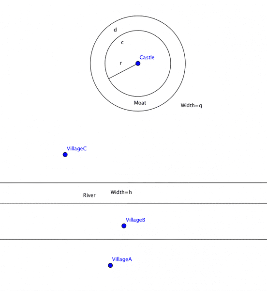 Villagers from village C often trade with a nearby castle with a circular moat of width q, and they want a road to be built to connect them to the castle. There has to be a bridge to pass over the moat, and that bridge has to point to the center of the circle (where the castle is). Where should the bridge be built to minimize the overall length of the road?