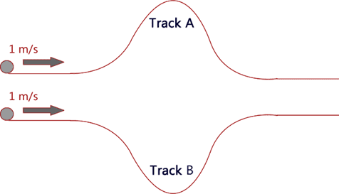 The discussion revolves around two frictionless tracks with equal length bumps, where participants are examining the energy dynamics of two balls moving along these tracks. The original poster questions which ball has more energy halfway through the track, considering they started at the same height.