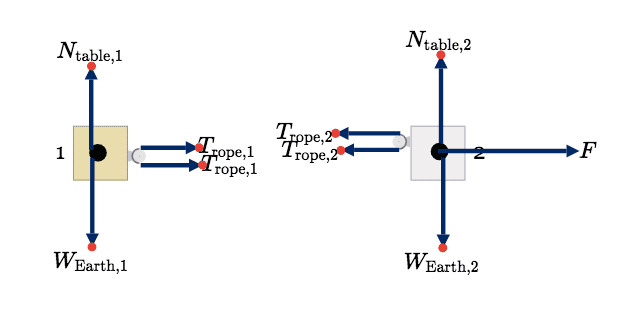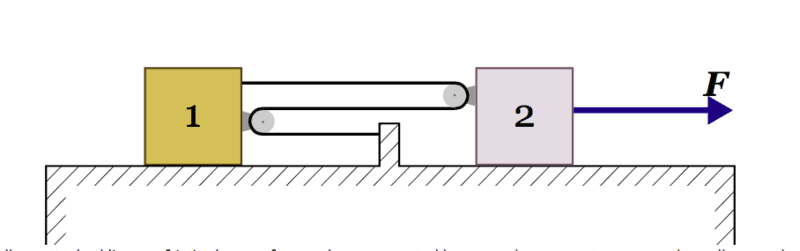 Two blocks with pulleys attached lie on a frictionless surface and are connected by a massless rope strung over the pulleys as shown at right. A force of magnitude F is applied to the second block. Draw a FBD for a system consisting of Block 1 and its pulley, and also a system consisting of Block 2 and its pulley. (See the screenshot attached.)