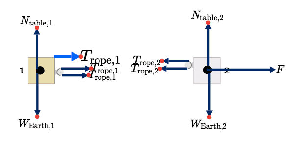Obviously, there are normal forces by the table on both systems as well as weight, and from each pulley we have two tension forces emanating. The system with block 2 also has an additional force of magnitude F towards the right. However, apparently there are still more forces I am missing, but I can't seem to find them...
