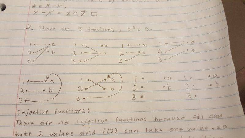 To me the number of functions that can be made are 6 because 3x2=6 but I have read online that n^m, n being the elements in the second set and m being the number of elements in the first set, gives you the number of functions. That equation gives me 8 functions but for the life of me I can't figure which functions I'm leaving out.