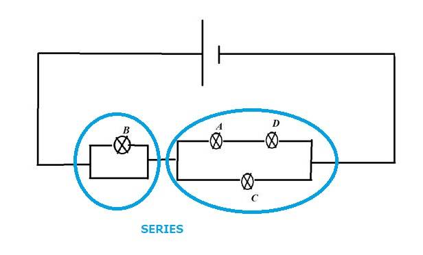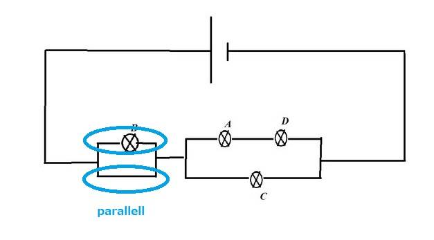 The one I do not understand in this figure is B parallel with the three lamps (A, D, C) or is it in series? Why do we say that B shines weaker?