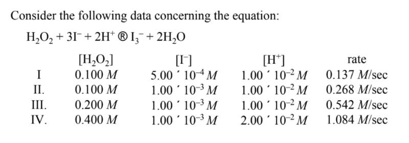 - There are inquiries about the effects of varying concentrations of reactants on the reaction rate, specifically regarding [I-], [H2O2], and [H+].