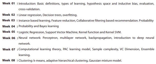 This course provides a concise introduction to the fundamental concepts in machine learning and popular machine learning algorithms. We will cover the standard and most popular supervised learning algorithms including linear regression, logistic regression, decision trees, k-nearest neighbour, an introduction to Bayesian learning and the naïve Bayes algorithm, support vector machines and kernels and neural networks with an introduction to Deep Learning. We will also cover the basic clustering algorithms. Feature reduction methods will also be discussed. We will introduce the basics of computational learning theory. In the course we will discuss various issues related to the application of machine learning algorithms. We will discuss hypothesis space, overfitting, bias and variance, tradeoffs between representational power and learnability, evaluation strategies and cross-validation. The course will be accompanied by hands-on problem solving with programming in Python and some tutorial sessions.